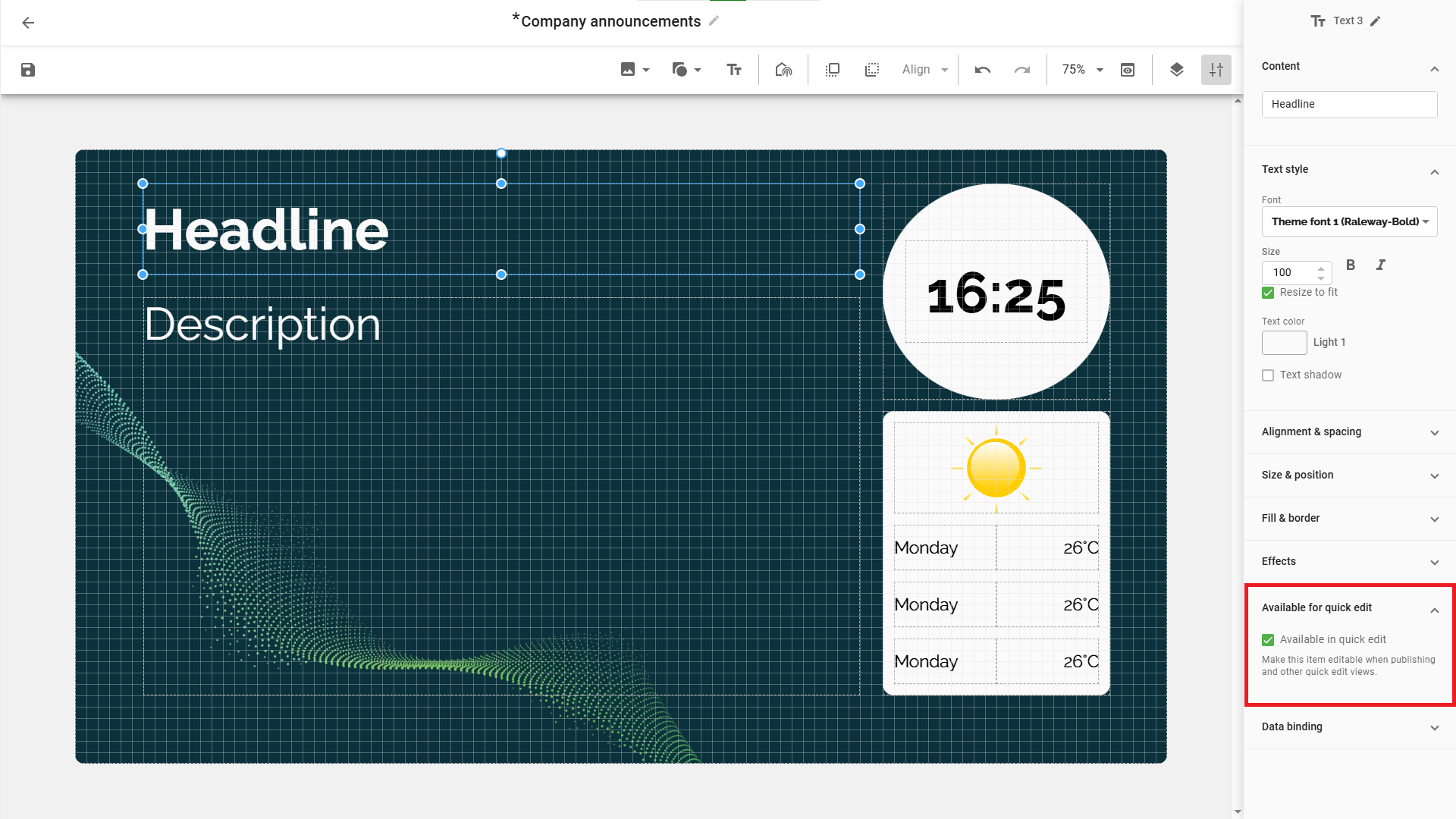 An important aspect with templates is the possibility to lock the feel and look of it. In Template Creator you can enable quick edit on items in the template where users are allowed change the information, but not select their own fonts, colors or change the layout of the template.